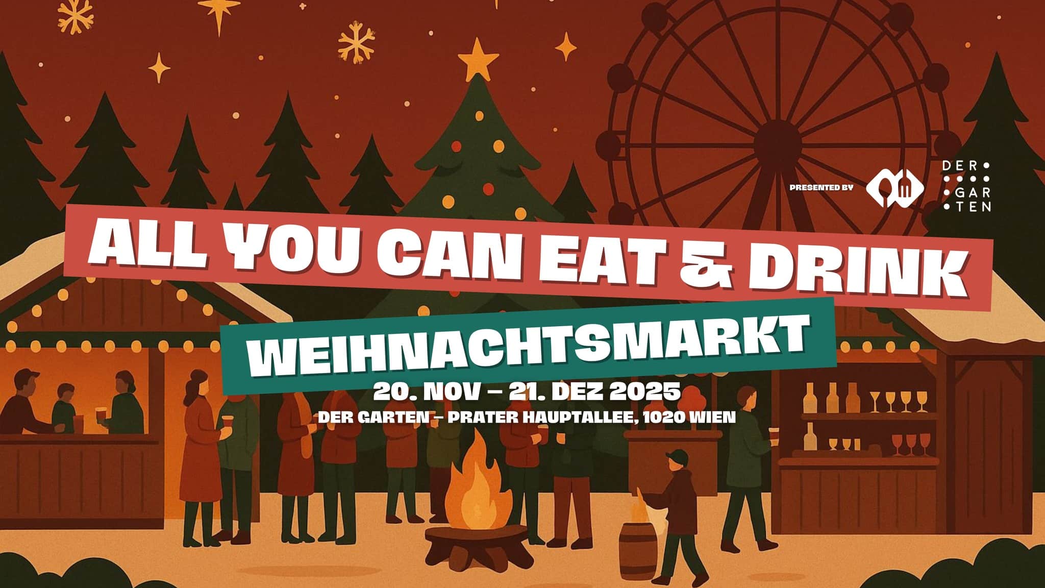 Erlebt im Der Garten Wien den ersten All You Can Eat & Drink Weihnachtsmarkt – mit festlichem Outdoor-Bereich, stimmungsvoller Musik und allem, was echte Weihnachtsfreude ausmacht!