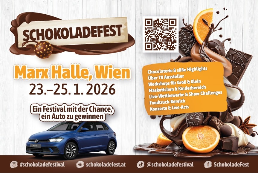 Das Schokoladenfestival kehrt vom 23. bis 25. Januar 2026 in die Marx Halle in Wien zurück – mit noch mehr Schokolade, mehr Unterhaltung, mehr Shows und noch mehr Spaß für die ganze Familie und Verliebte! Denn das Festival steht ganz im Zeichen des Valentinstags. Wir arbeiten daran, euch noch mehr Überraschungen zu bieten!