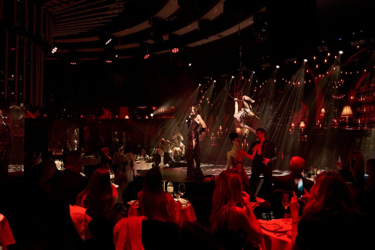 Das Besondere? Es gibt keine klassische Trennung zwischen „da oben wird performt“ und „da unten wird gegessen“. Das gesamte Lokal ist die Bühne. Während du an deinem Drink nippst, schwingen sich Luftakrobaten über deinen Kopf, Tänzer wirbeln zwischen den Tischen durch und das Personal ist Teil der Story. Es ist laut, es ist bunt, und es ist verdammt sexy.